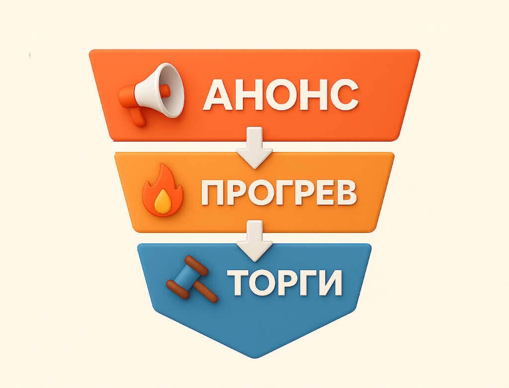 Привлечь участников на торги — это простая и понятная технология. Весь процесс можно разбить на три этапа, которые мы называем формулой «Анонс → Прогрев → Торги». На этапе анонса вы создаете интригу, на этапе прогрева — повышаете ценность лота с помощью сторителлинга, а во время торгов — управляете ажиотажем, чтобы получить максимальные ставки.