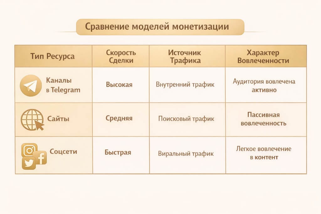 Матрица сравнения моделей монетизации для разных типов ресурсов: скорость сделок, источник трафика и характер вовлеченности в Telegram, на сайтах и в соцсетях.