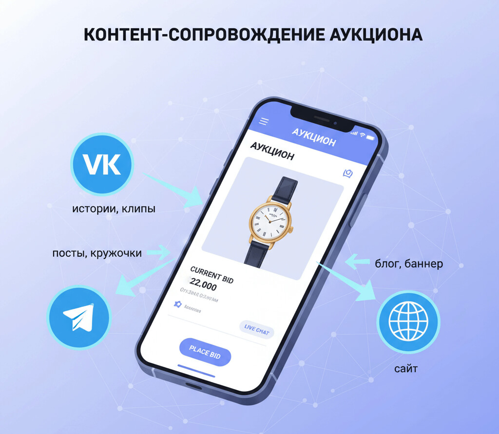 Контент-сопровождение — это маркетинговая стратегия по удержанию внимания аудитории к вашему аукциону, пока он идет в автоматическом режиме. Ваша работа не заканчивается после старта торгов; она трансформируется в задачу по подогреву интереса и возвращению трафика на страницу аукциона. В этом руководстве мы разберем универсальную 3-этапную модель («До, Во время, После») и покажем, как применять ее на разных площадках: в Telegram, на вашем сайте или в группе ВКонтакте.